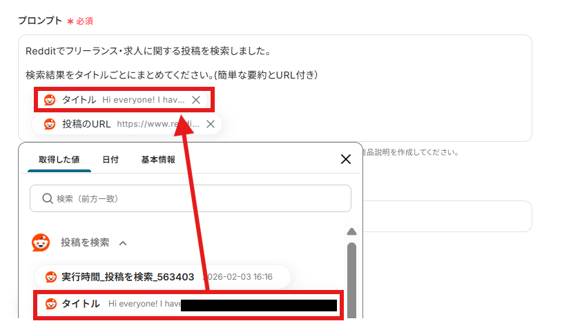 - Redditに投稿するタイトルや本文は、固定のテキストだけでなく、トリガーで取得したYouTubeの動画タイトルやURLなどを組み込んで自動作成できます。
