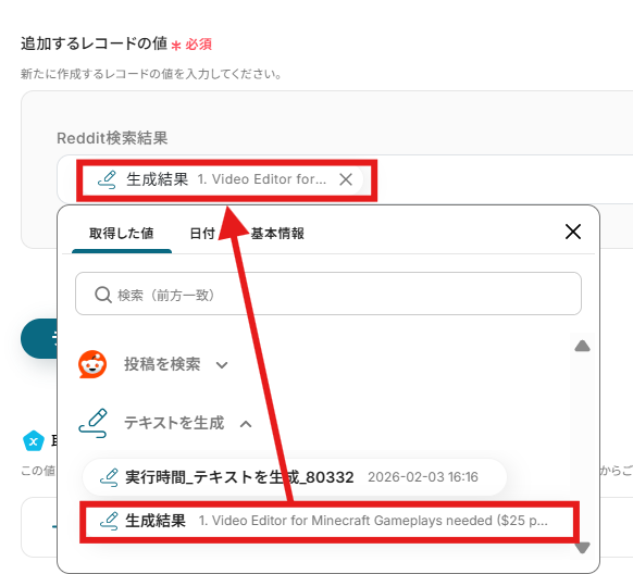 追加するレコードの値は、以下のように取得した値から入力してください。
