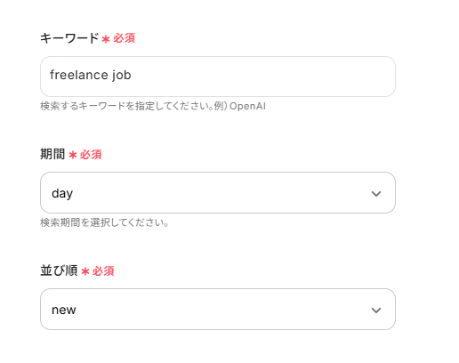 キーワード、期間、並び順はデフォルトの入力値と注釈を参考に入力してください。