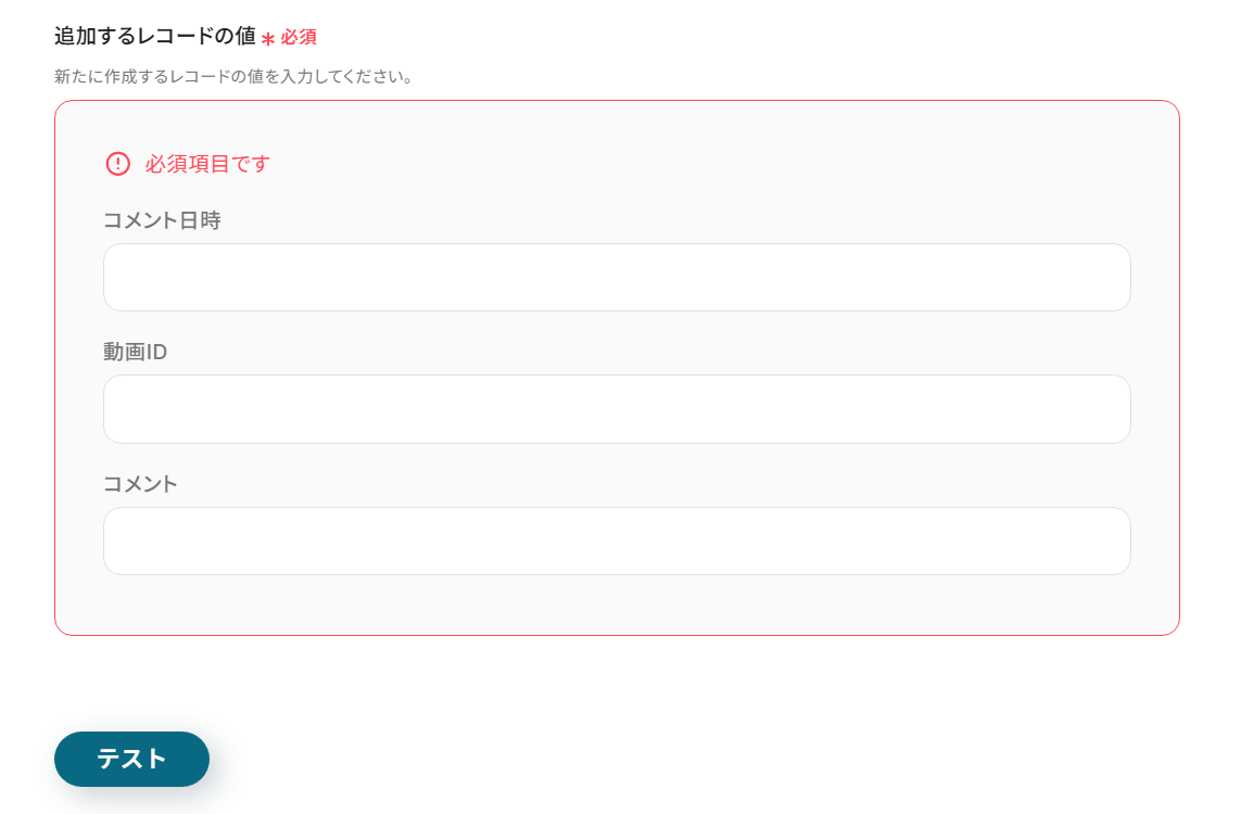同様に「コメントの原文テキスト」もボックスを埋めることができたら、Google スプレッドシートとの連携テストを行います。テストボタンをクリックしましょう。
