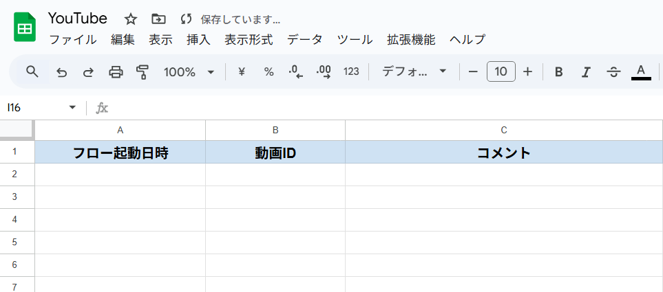 今回はYouTubeの動画追跡業務の自動化として、コメントデータをGoogle スプレッドシートに蓄積するフローとなります。そのため、コメントを集約するGoogle スプレッドシートを用意しておきましょう。