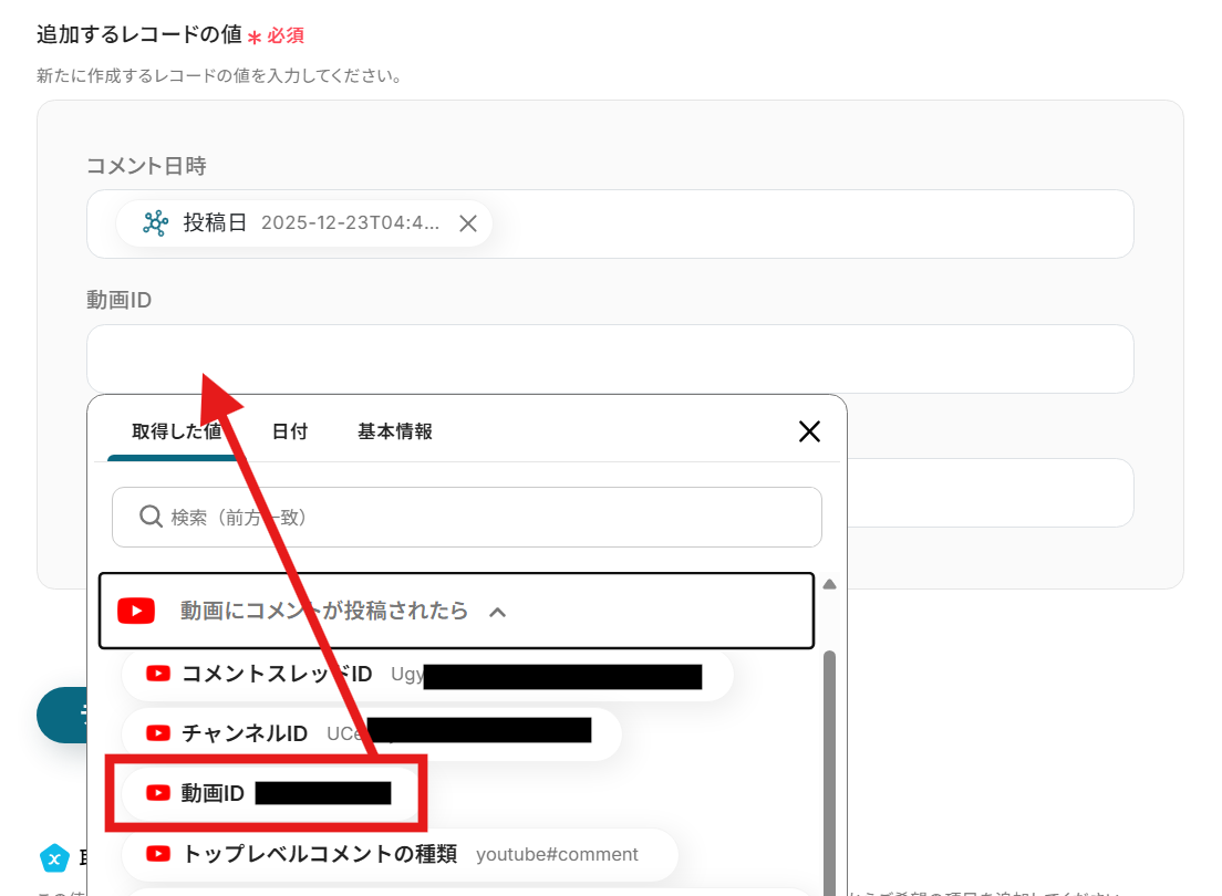 同じように「動画にコメントが投稿されたら」のプルダウンをクリックし、動画IDを選択します。
