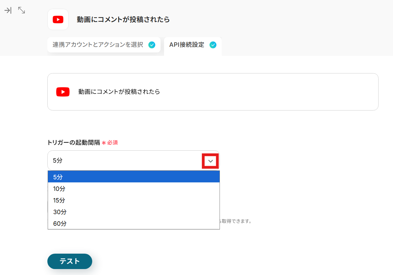 - トリガーは5分、10分、15分、30分、60分の間隔で起動間隔を選択できます。