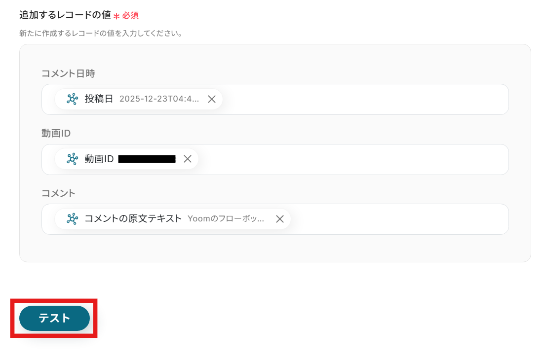 その後Yoomの設定画面に戻り、テストをクリックします。