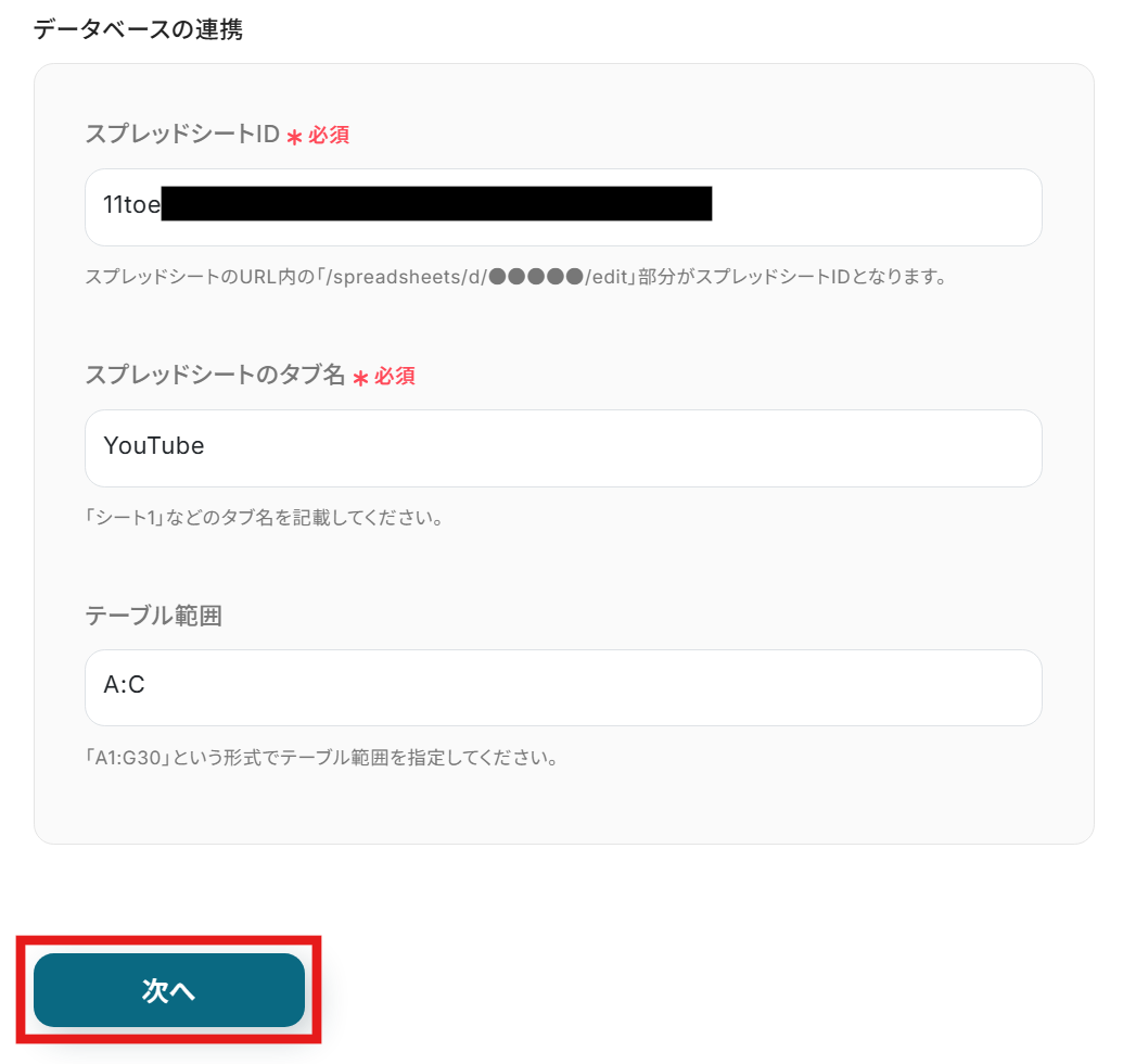 続けて、使用するGoogle スプレッドシートの情報を入力します。Google スプレッドシートのIDとタブ名をプルダウンから入力しましょう。