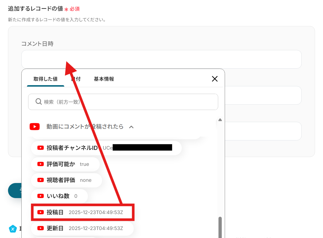 例として、コメント投稿日時を取得した値を用いて設定してみましょう。