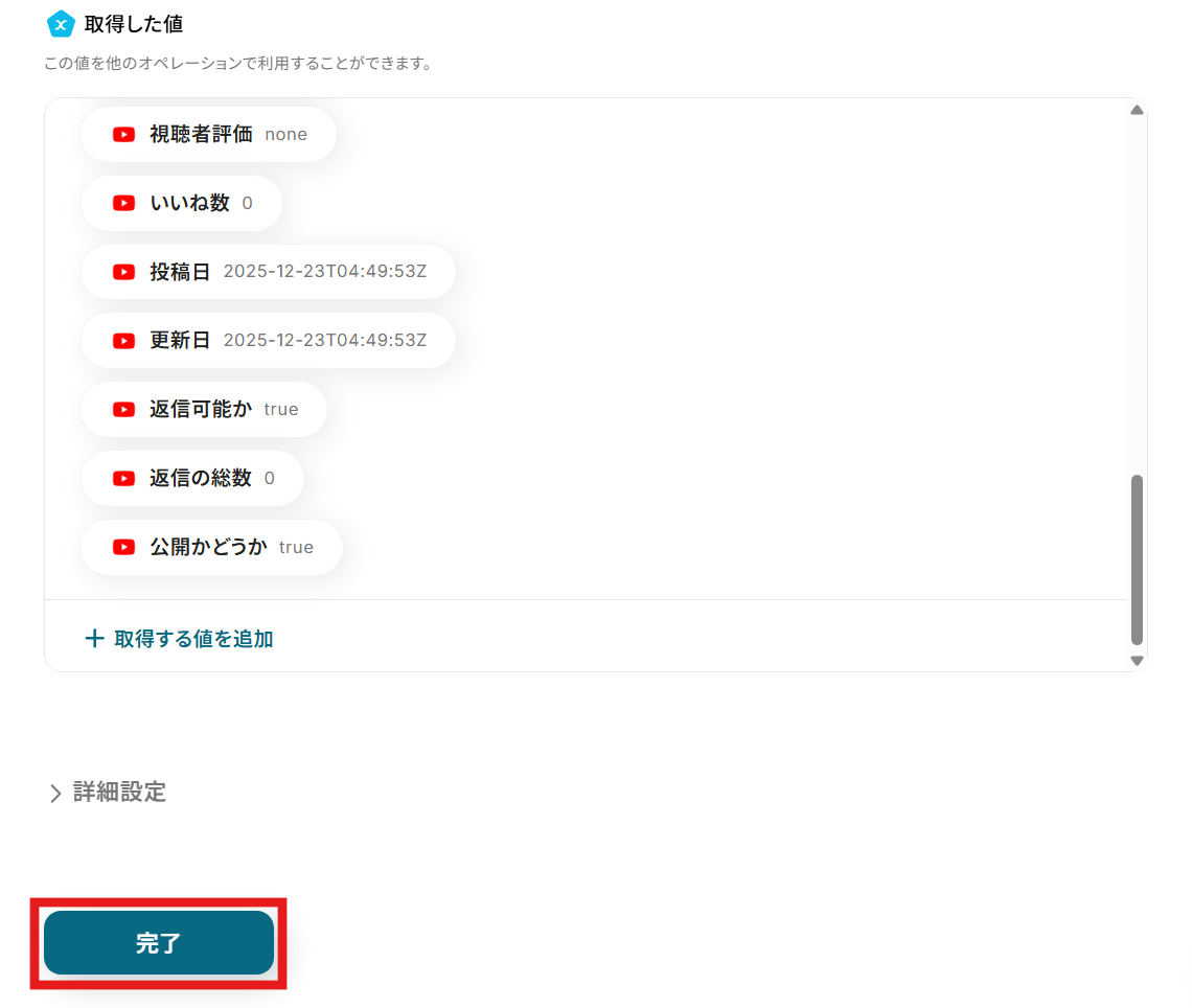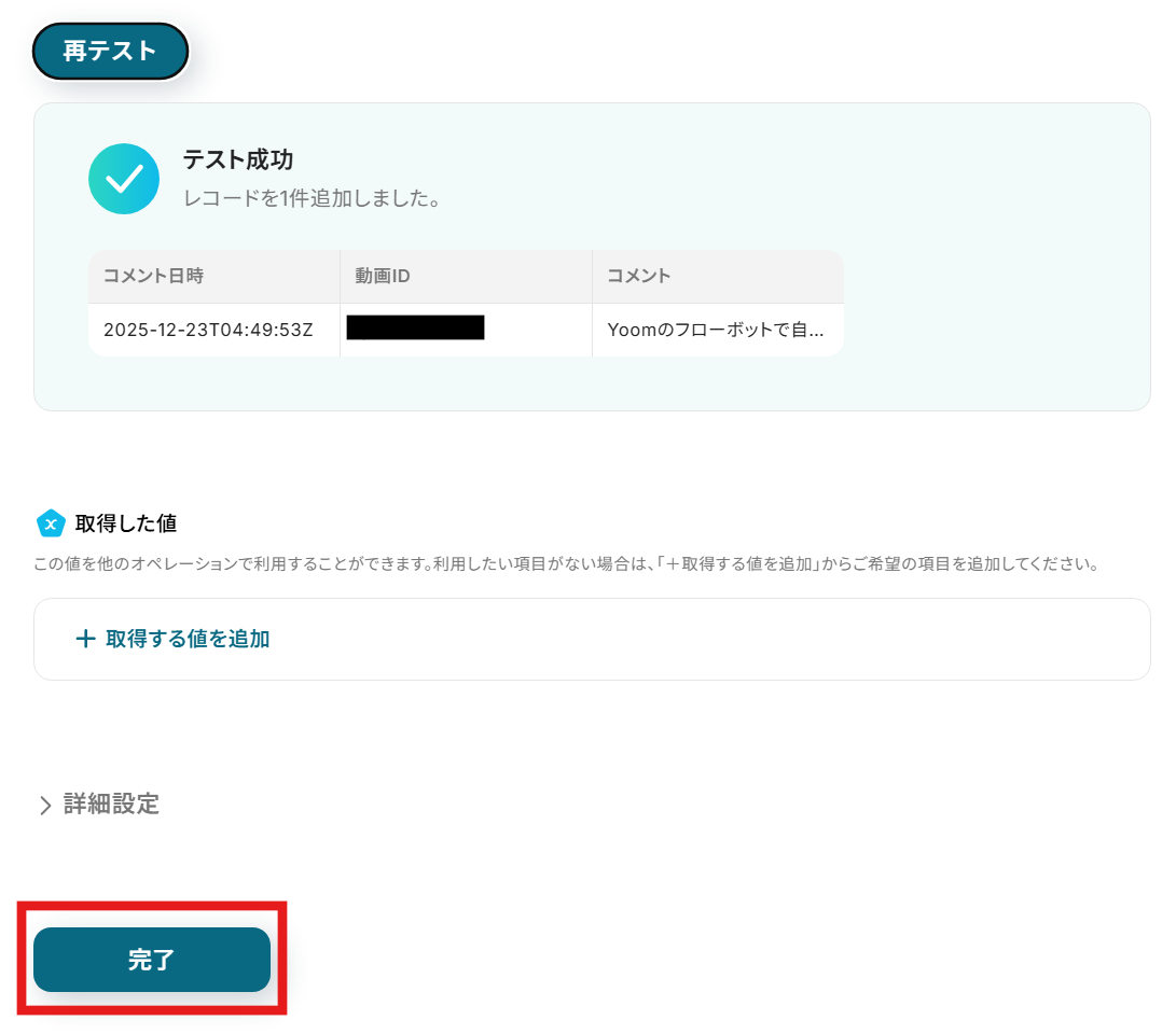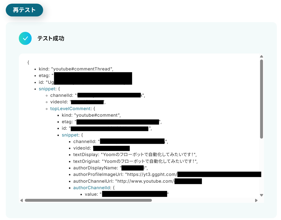 テストが成功するとテスト成功画面と取得した値が表示され、YouTubeのコメントが確認できます。「完了」をクリックして設定完了です!