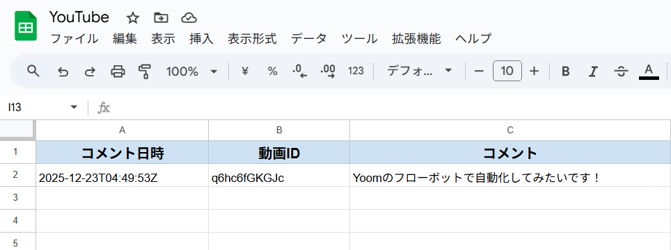 こうすることで、YouTubeの動画にコメントが付いた日時が、Google スプレッドシートに自動で記載されるようになります。