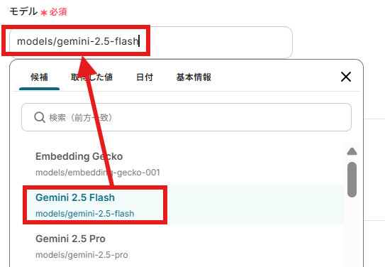 今回使用したいGeminiのモデル名を候補から指定します。