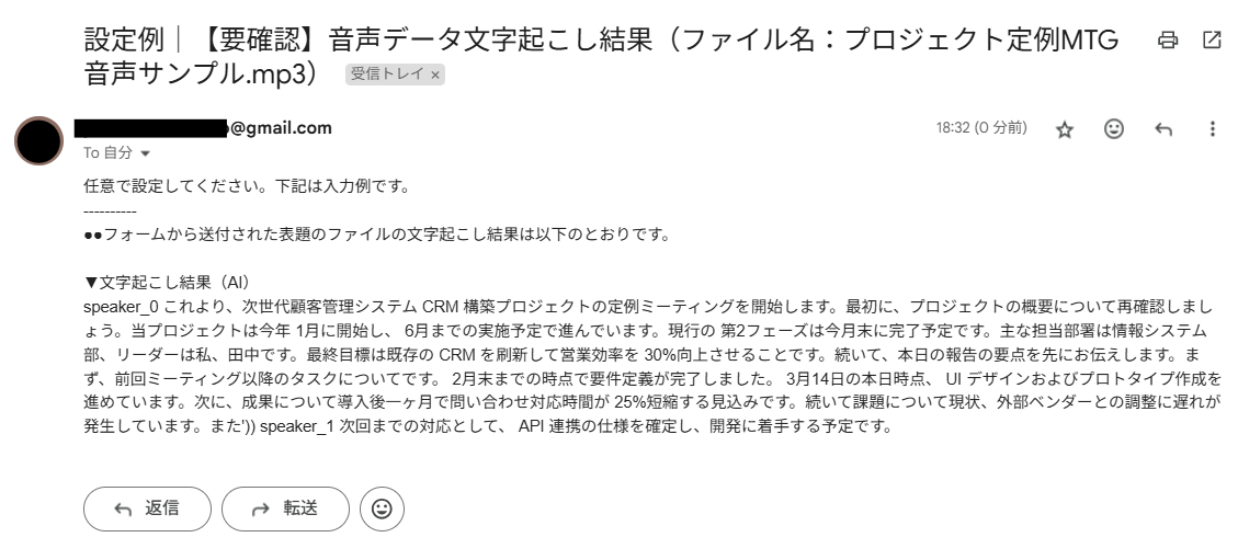 メールで受け取った音声データを文字起こしおよび要約して、メール送信者へ再度メールで返信する