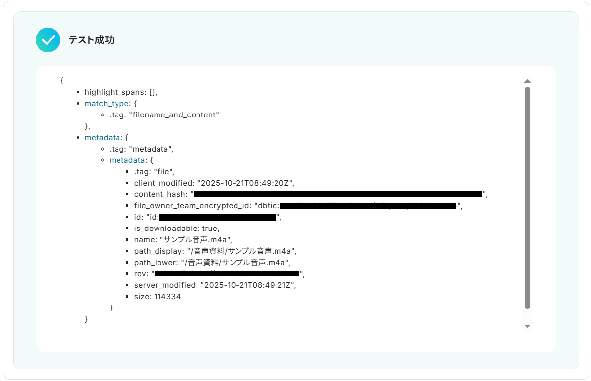 ファイル名の欄にはDropboxから取得した「ファイル名」の値が予め設定されているので、そのままテストしてください。
