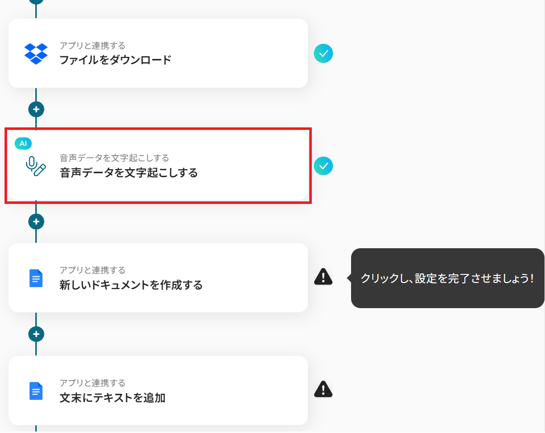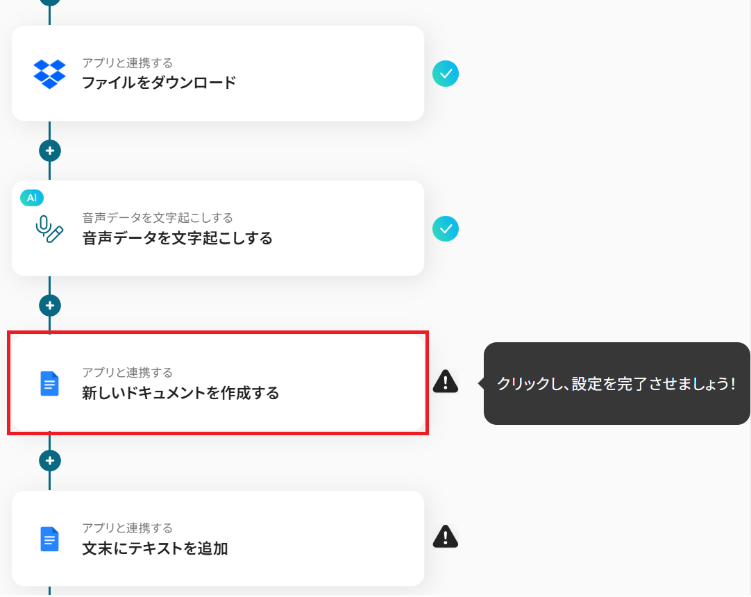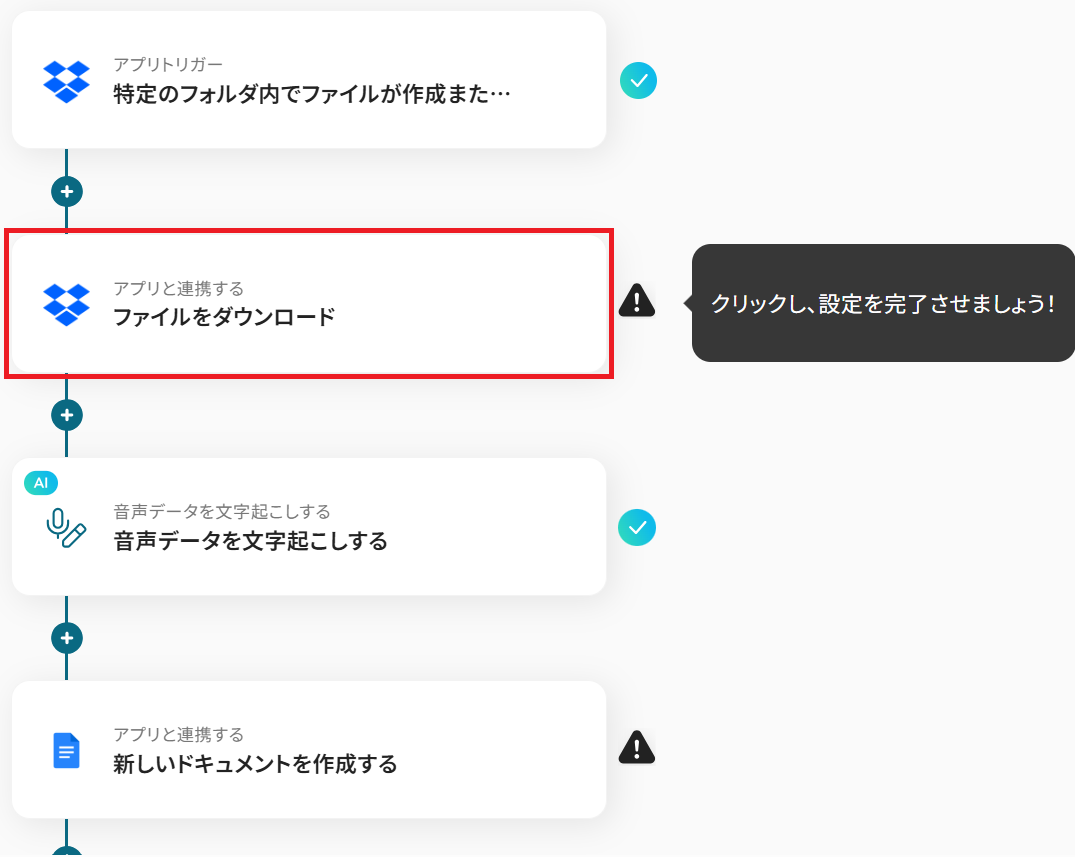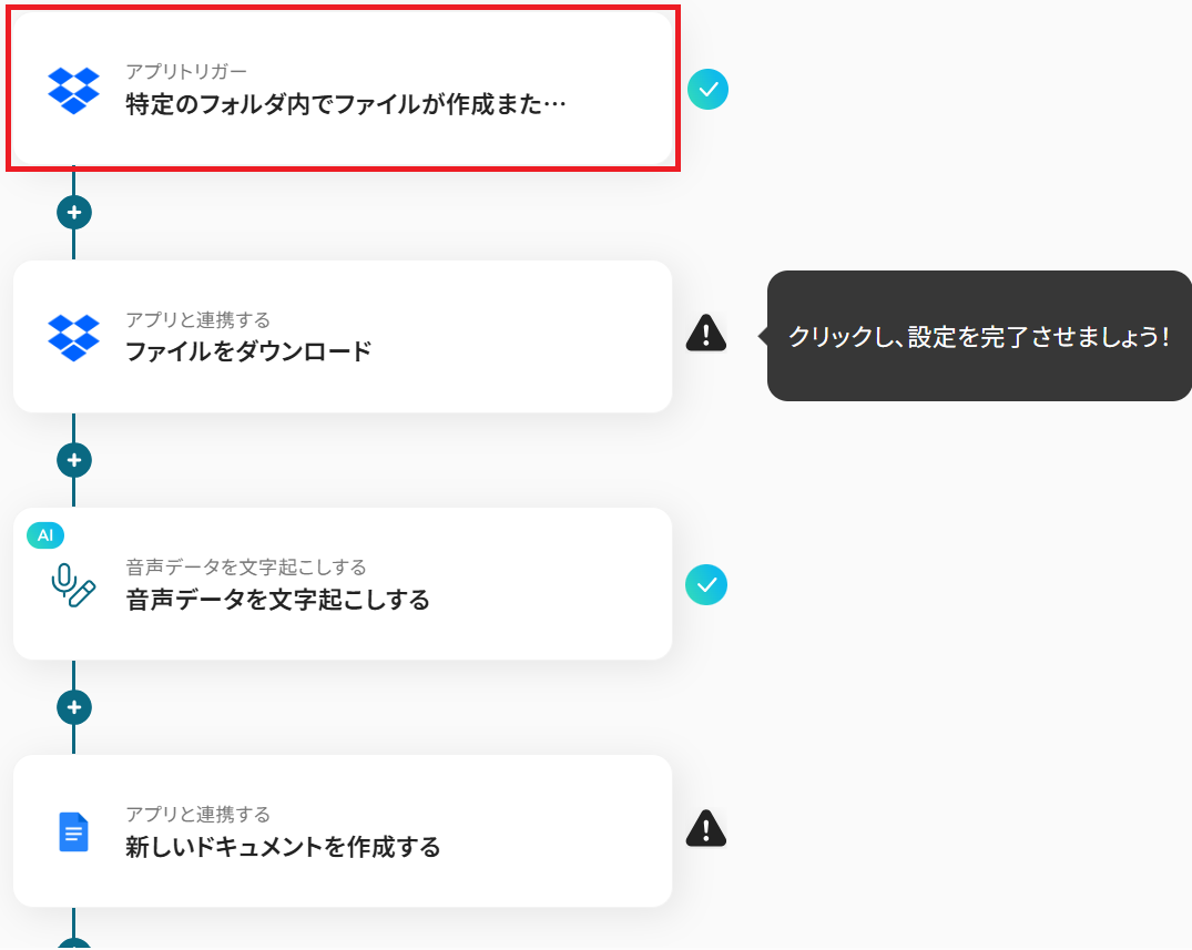 それではここから代表的な例として、Dropboxに音声データがアップロードされたら、文字起こしを行い新規Googleドキュメントに結果を追加するフローを解説していきます!