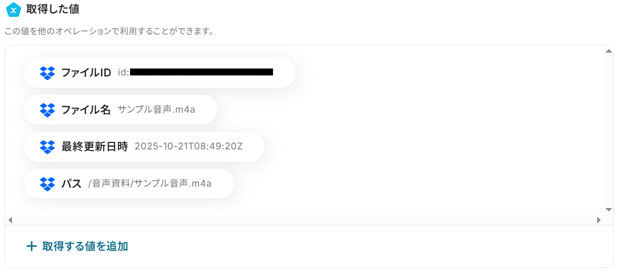 ※以下のように取得した値を設定することで、トリガーが実行されるたびに最新のファイル情報を反映できます。