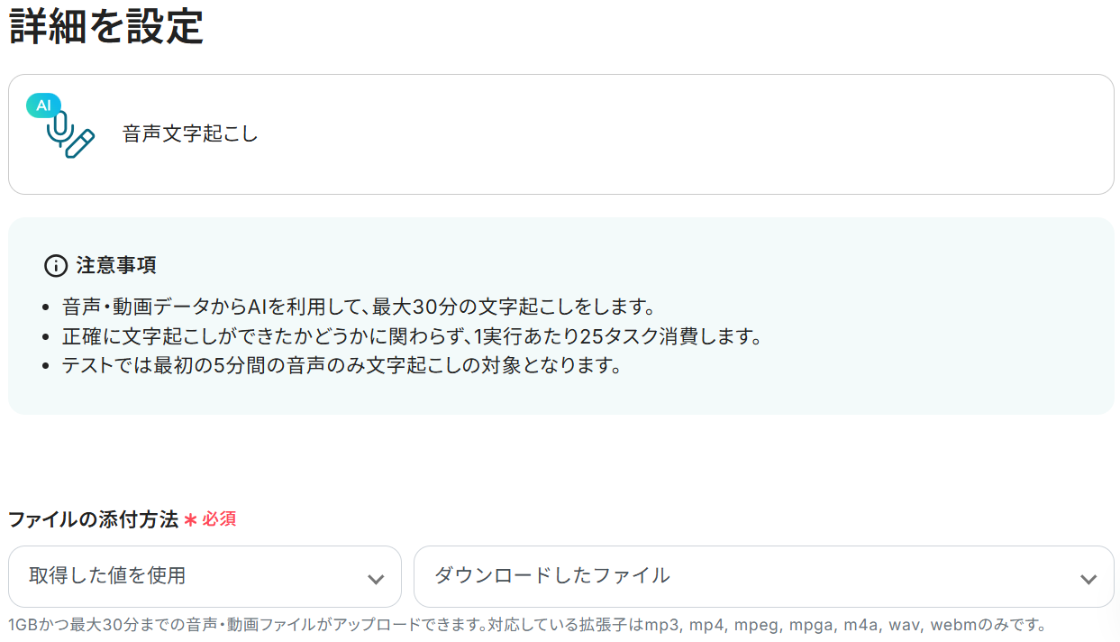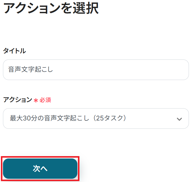 文字起こし機能のアクションは最大30分(25タスク)・60分(50タスク)・90分(75タスク)の3種類ありますので、音声の長さに合わせて選択してください。