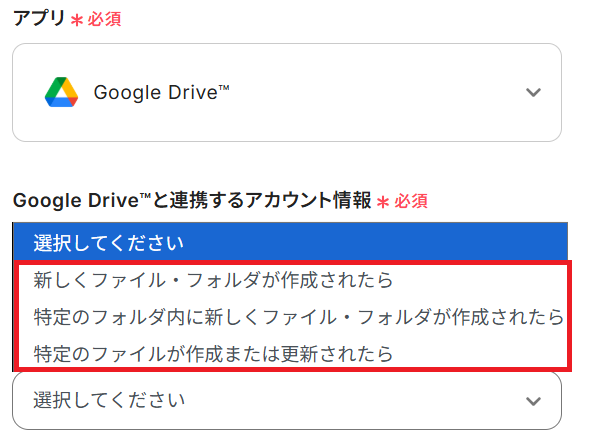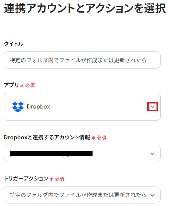 タイトルと連携するアカウント情報を任意で設定し、トリガーアクションはテンプレート通りに「特定のフォルダ内でファイルが作成または更新されたら」のまま「次へ」をクリックします。