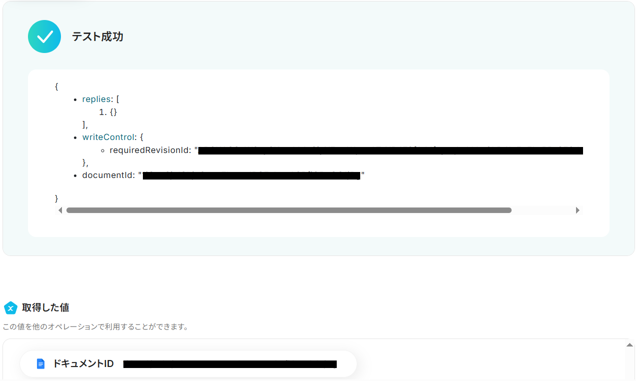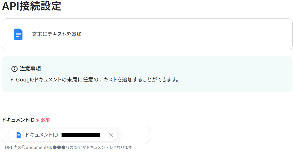ドキュメントIDの欄には、ステップ4と同様にGoogleドキュメントから取得した「ドキュメントID」の値が予め設定されているのでそのままでOKです。