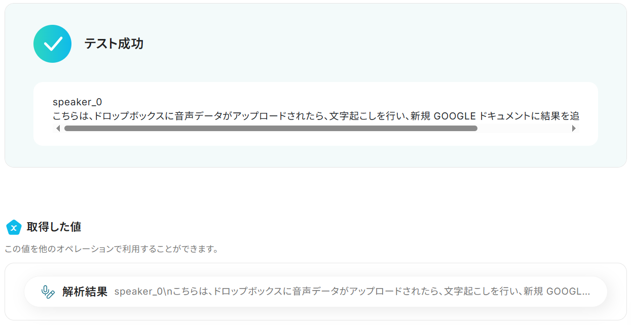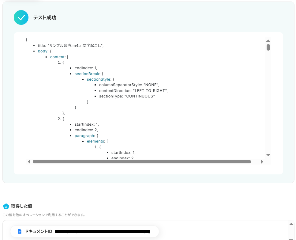 Dropboxの音声ファイルの内容を文字起こししたテキストが、新規作成したGoogleドキュメントの文末に追記されました!