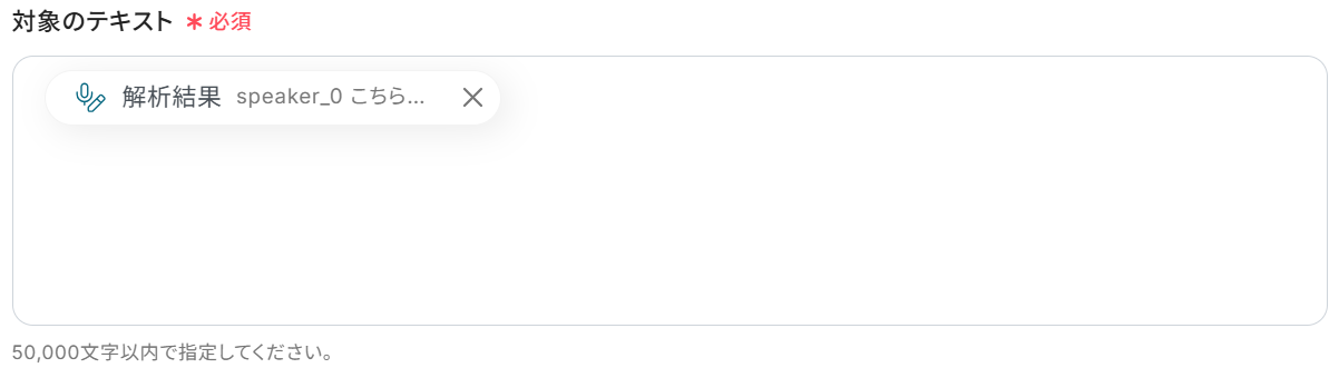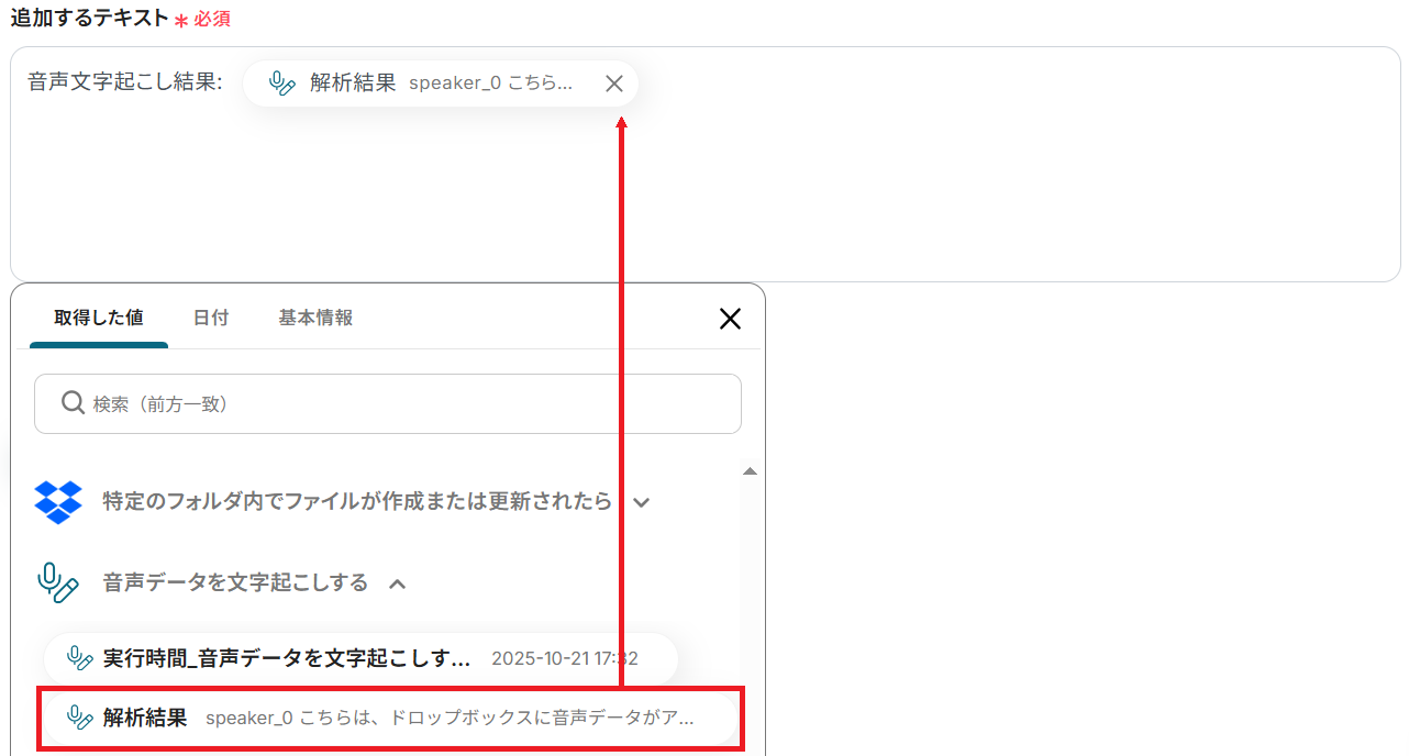 追加するテキストも設定されていますが、Dropbox・文字起こし機能から取得した値などの変数や固定の文章を組み合わせて自由にカスタマイズできます。