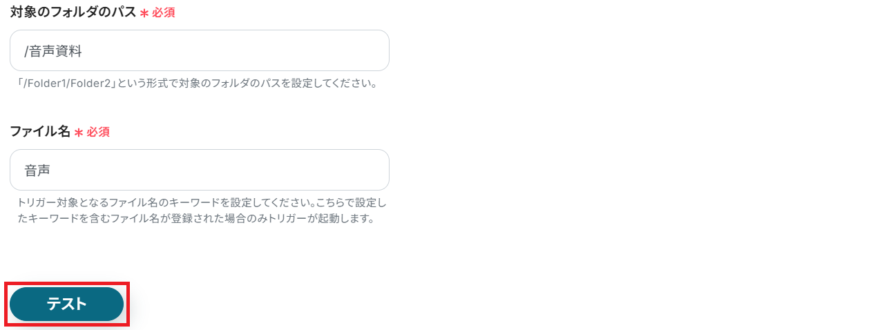 最後に、トリガー対象となるファイル名のキーワードを入力しましょう。今回は「音声」というキーワードにしました。