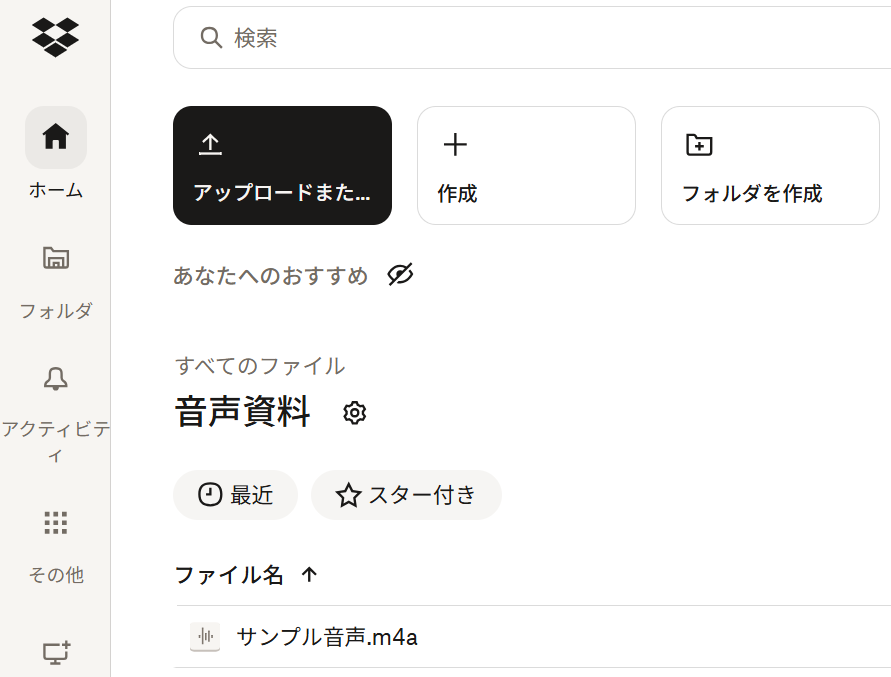 今回は例として「音声資料」フォルダを作成し「こちらは、Dropboxに音声データがアップロードされたら、文字起こしを行い新規Googleドキュメントに結果を追加するフローのテストです」と吹き込んだm4aファイルをアップロードしました。