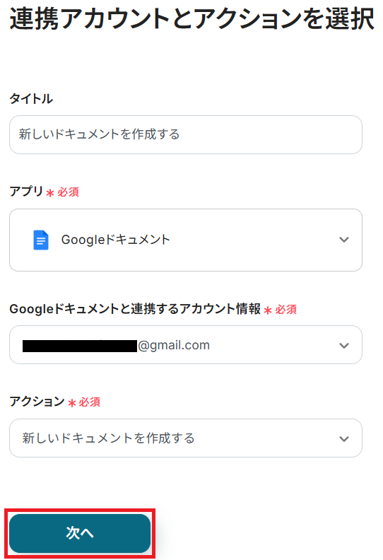 これまでのステップと同様、アクションは「新しいドキュメントを作成する」のまま「次へ」をクリック。
