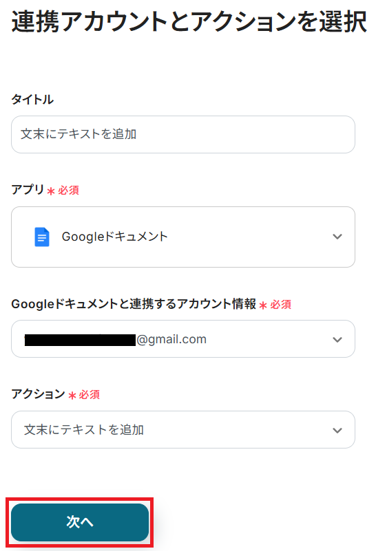 アクションは「文末にテキストを追加」のまま「次へ」をクリック。
