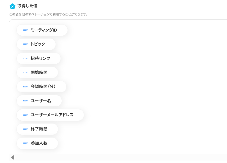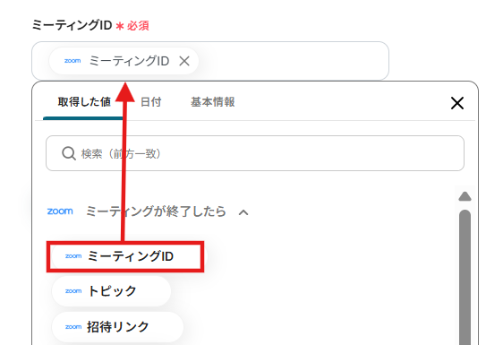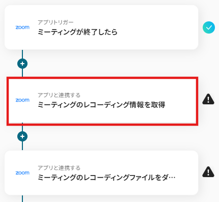 - 続いて、オペレーションでZoomの「ミーティングのレコーディング情報を取得」アクションを設定し、終了した会議の録画情報を取得します。