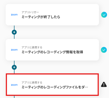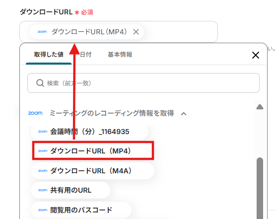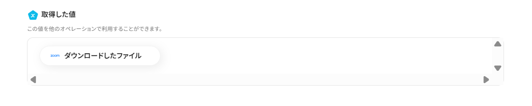 - さらに、オペレーションでZoomの「ミーティングのレコーディングファイルをダウンロード」アクションを設定し、録画音声ファイルを取得します。