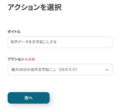 - 続けて、オペレーションで文字起こし機能の「音声データを文字起こしする」アクションを設定し、ダウンロードした音声ファイルを指定します。