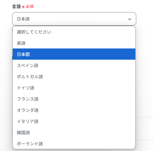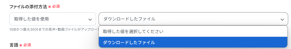 - AI機能の「音声データを文字起こしする」では、対象となる音声ファイルの添付方法や言語(日本語、英語など)を任意で設定できます。