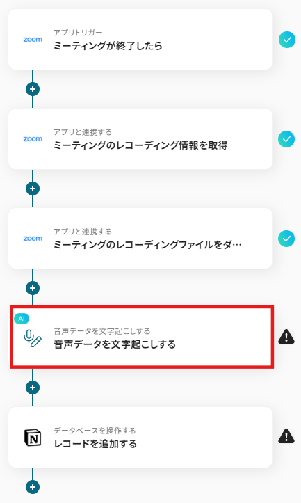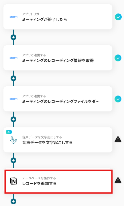 それではここから代表的な例として、Zoom会議が終了した際に、その録画音声ファイルを自動で文字起こしし、その結果をNotionのデータベースに新しいレコードとして追加するフローを解説していきます!
