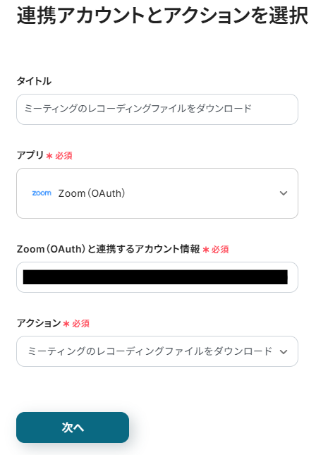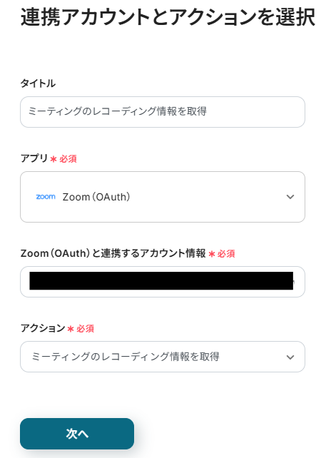 タイトルと連携するアカウント情報を任意で設定し、トリガーアクションはテンプレート通りに「ミーティングが終了したら」のまま「次へ」をクリックして進んでください。