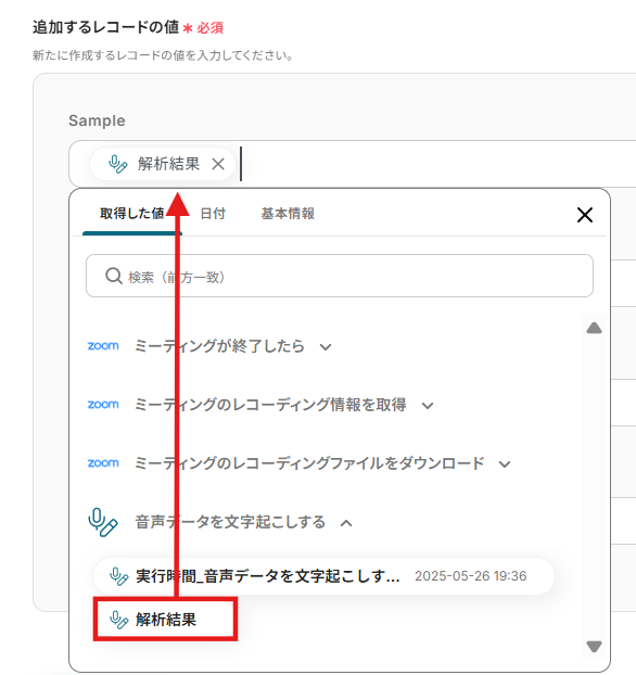 4.「追加するレコードの値」に先ほど取得したアウトプットを選択します。