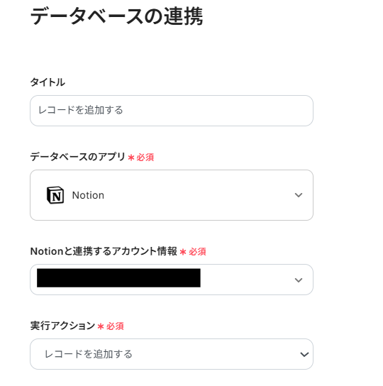 先ほどと同様にタイトルと連携するアカウント情報を任意で設定し、アクションはテンプレート通りに「レコードを追加する」のまま、下にスクロールしましょう。