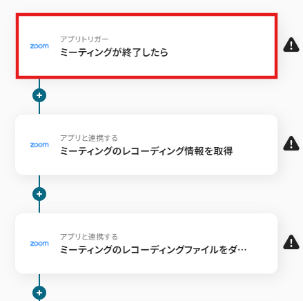 - 次に、トリガーでZoomを選択し、「ミーティングが終了したら」というアクションを設定します。これにより、Zoom会議が終了したタイミングでフローボットが起動します。