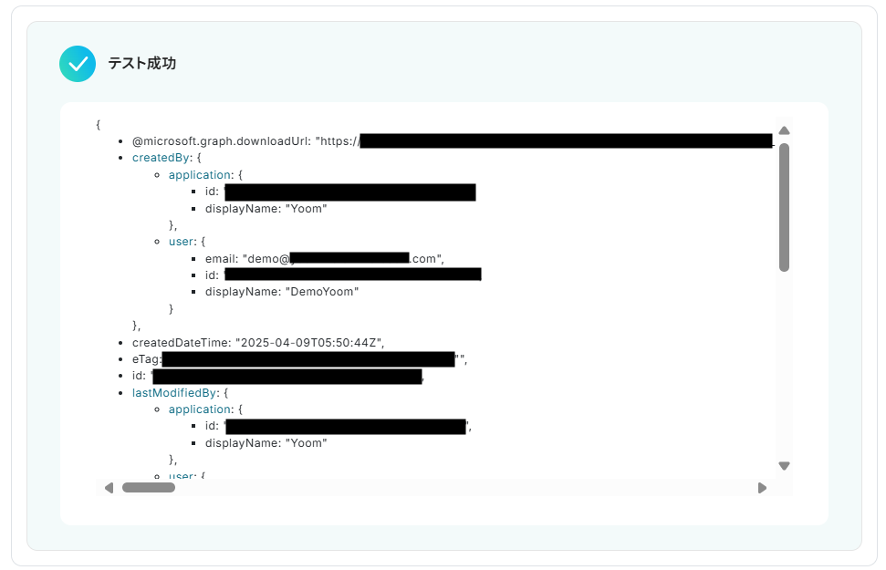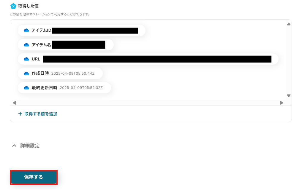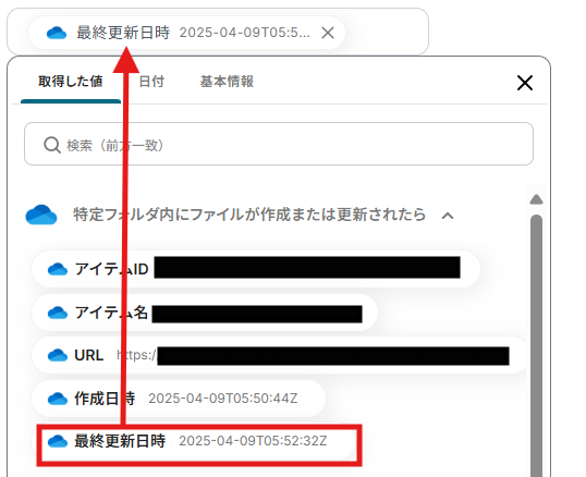 なお、最終更新日時は先ほど取得したOneDriveのアウトプットから選択します。