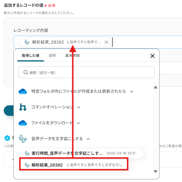 追加するレコードの値には文字起こししたアウトプットを使用して入力します。