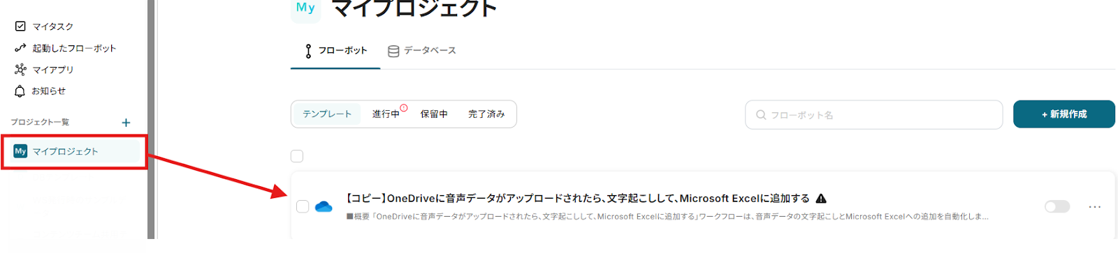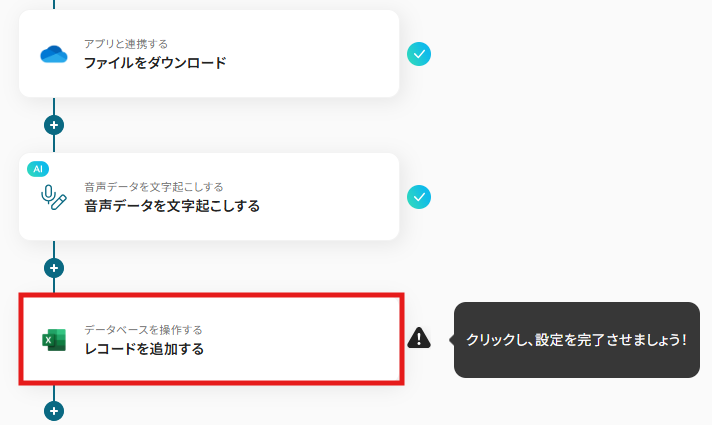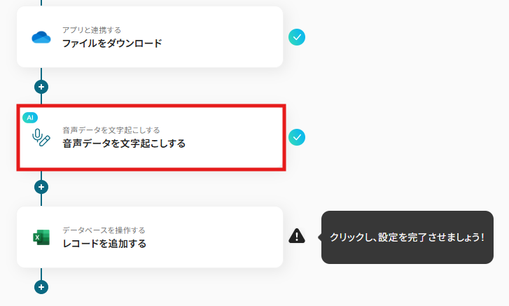 1) フローに戻り、「音声データを文字起こしする」のアイコンをクリックします。