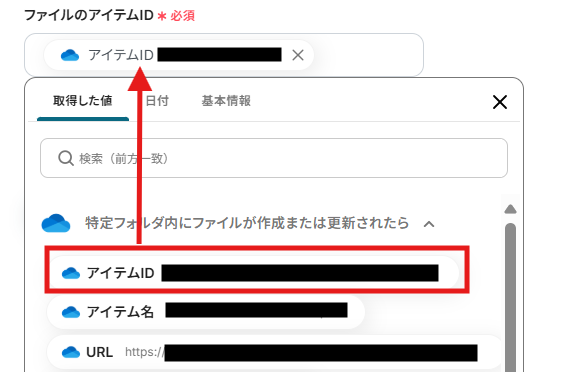 3) ファイルのアイテムIDは先ほど同様にアウトプットから選択してください。