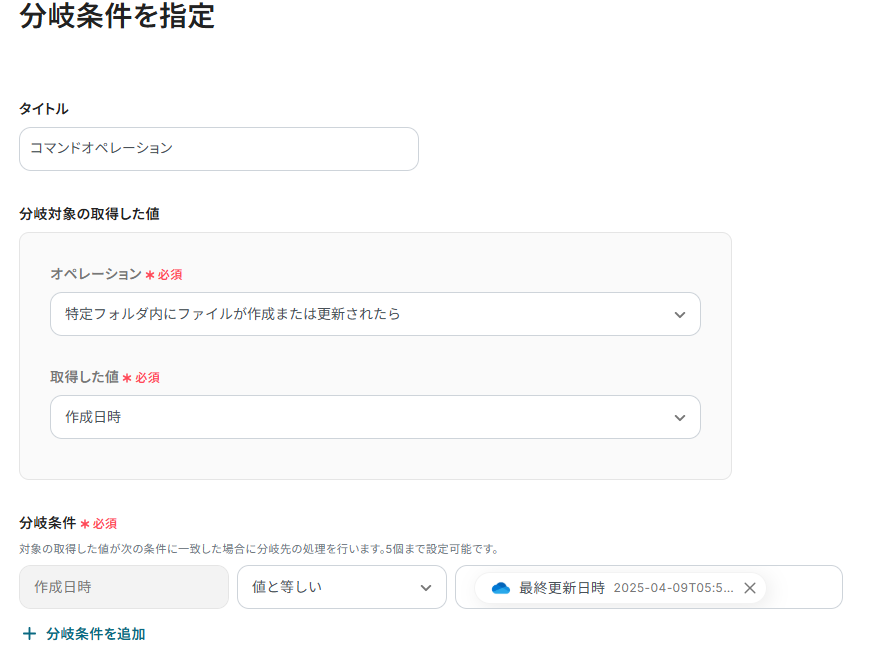 2) 分岐対象のアウトプットのオペレーションは「特定フォルダ内にファイルが作成または更新されたら」、取得した値は「作成日時」を選択し、分岐条件が「作成日時」「値と等しい」「最終更新日時」になっていることを確認して「保存」をクリックします。