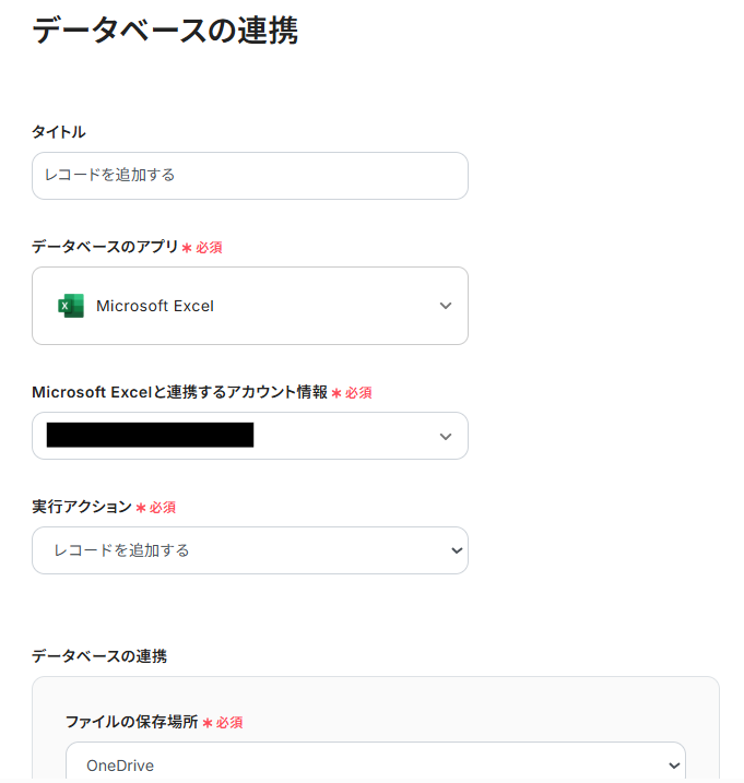 2) アクションは「レコードを追加する」を選択して、データベースの連携で記録するMicrosoft Excelのファイル情報を入力して「次へ」をクリックします。