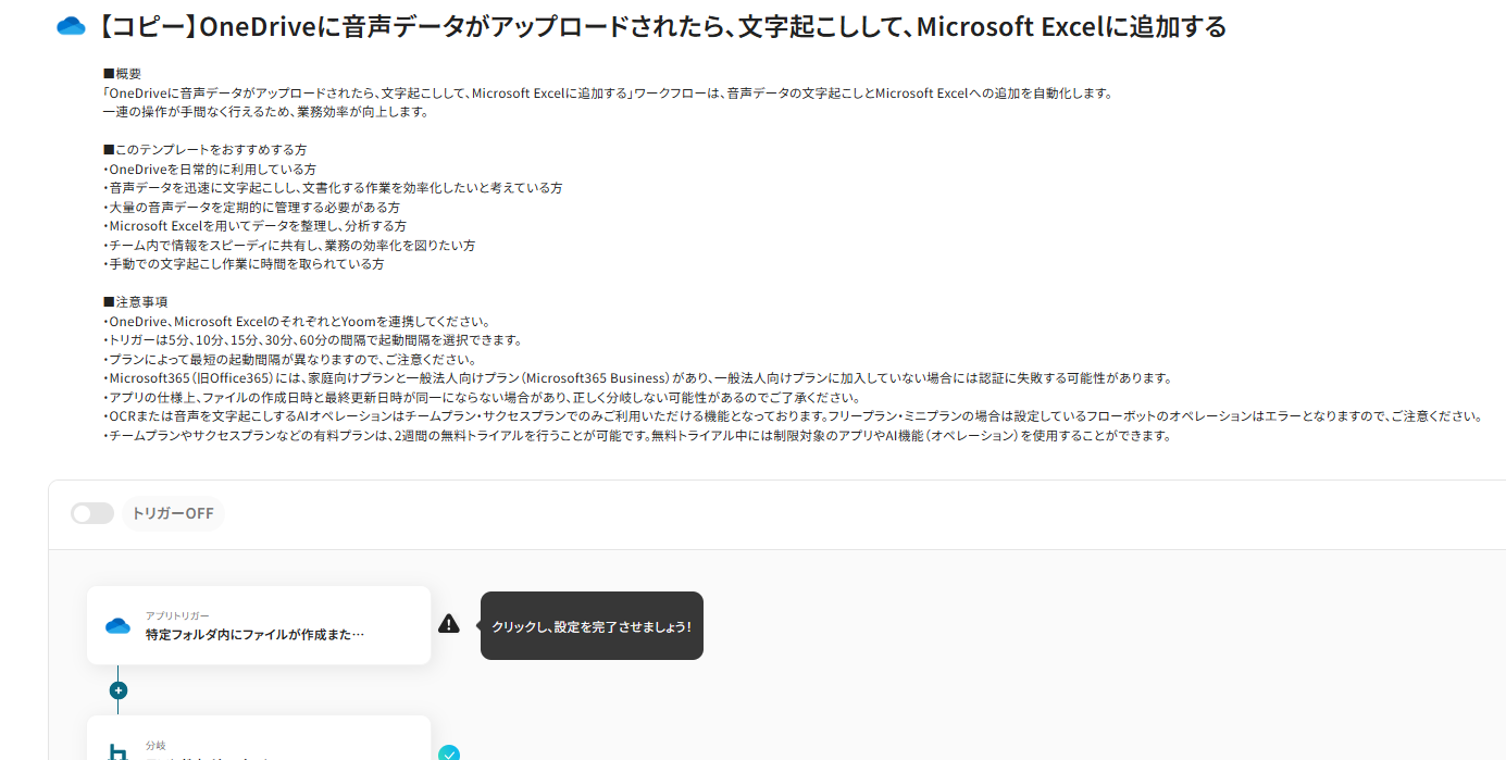 ここでは、代表的な例として、OneDriveにアップロードされた音声ファイルを自動で文字起こしし、その結果をMicrosoft Excelの指定したシートに追記する自動化フローの作成手順を解説します。