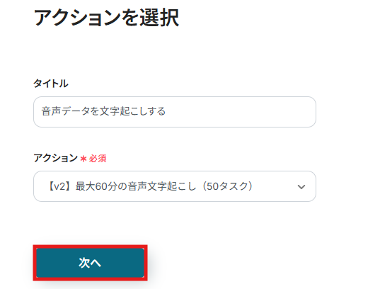 2) アクションは「最大60分の日本語音声文字起こし(50タスク)」が選択されていることを確認し、「次へ」をクリックします。