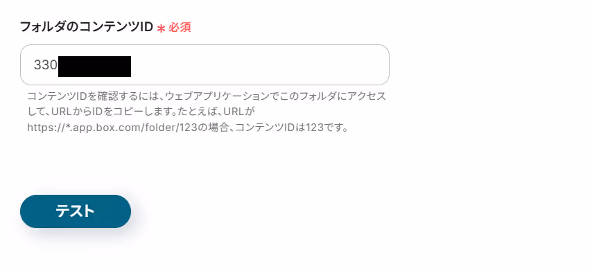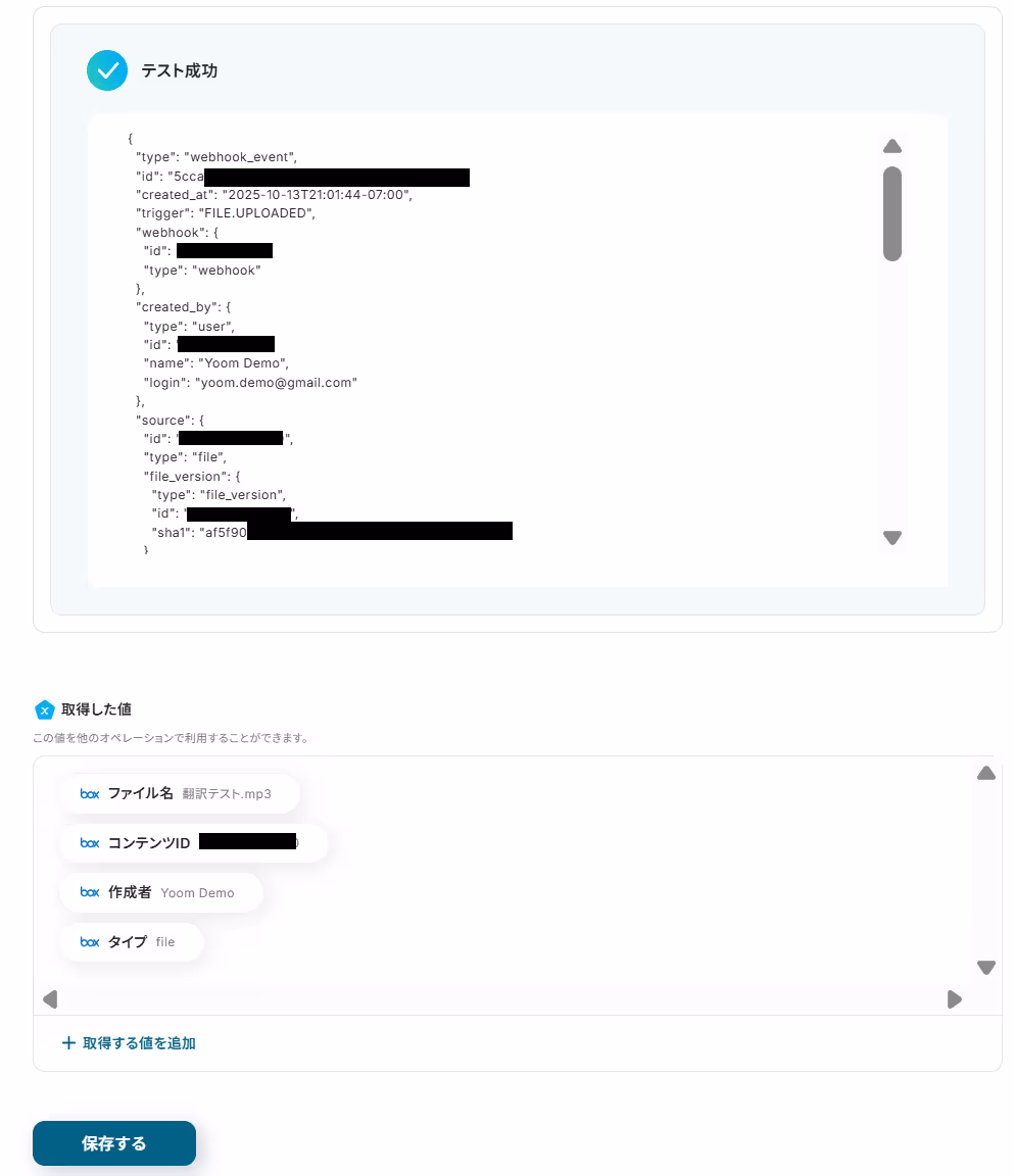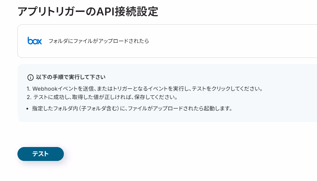 この画面で、「テスト」をクリックする前に、Webhookイベント(Boxにファイルをアップロード)を実行します。