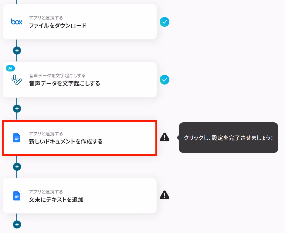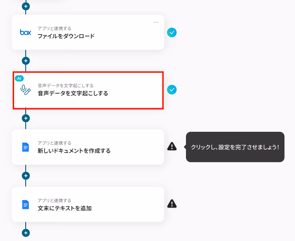 それでは例として、Boxに音声ファイルがアップロードされたら、自動で文字起こしを行い、結果をGoogleドキュメントに記録するフローを解説していきます!
