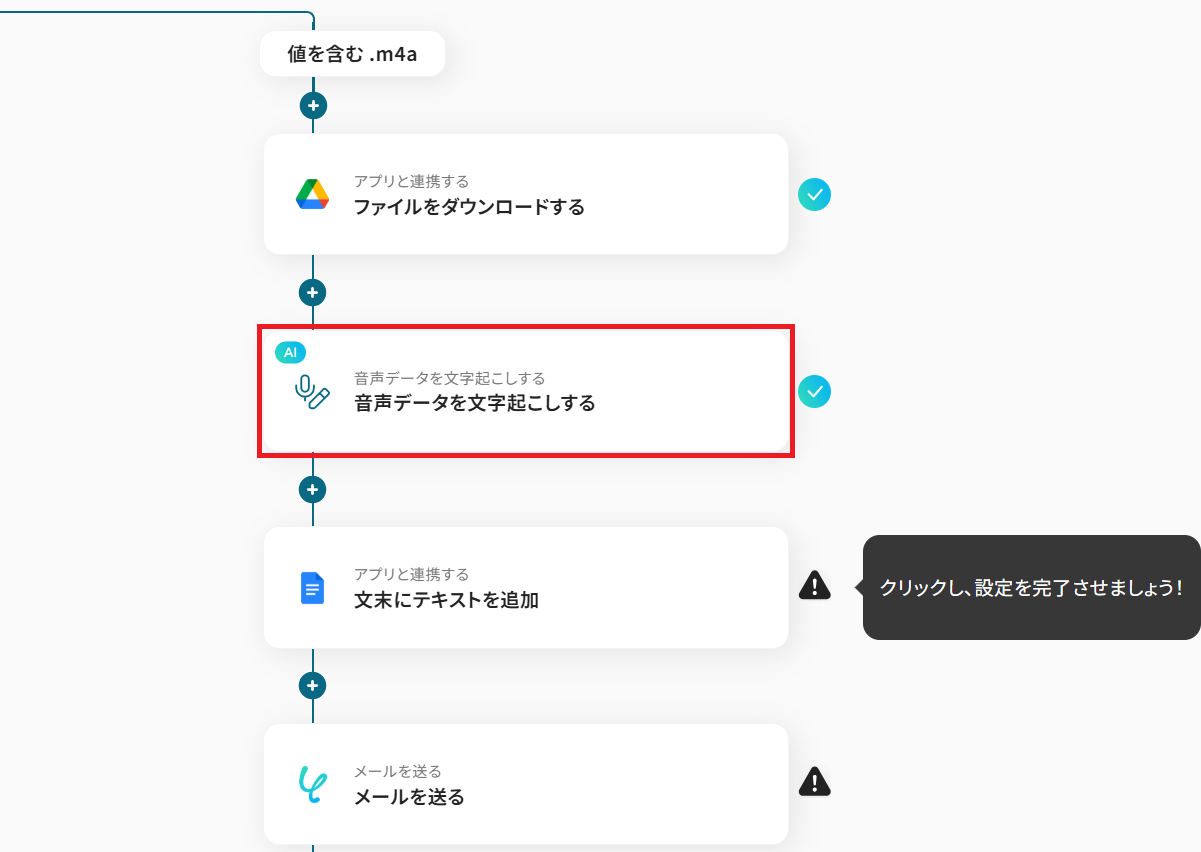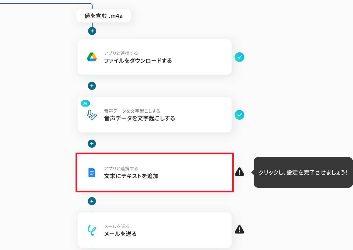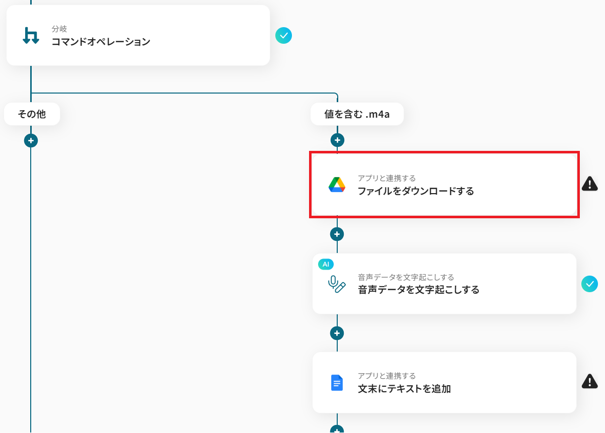 今回は、取得した値(ファイル名)が「.m4a」という値を含む場合に次のステップに進むよう設定しています。