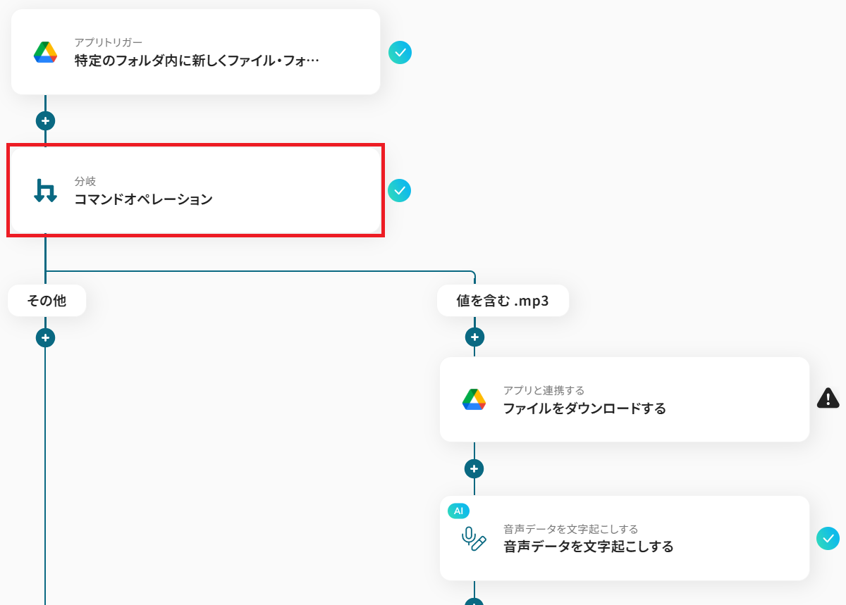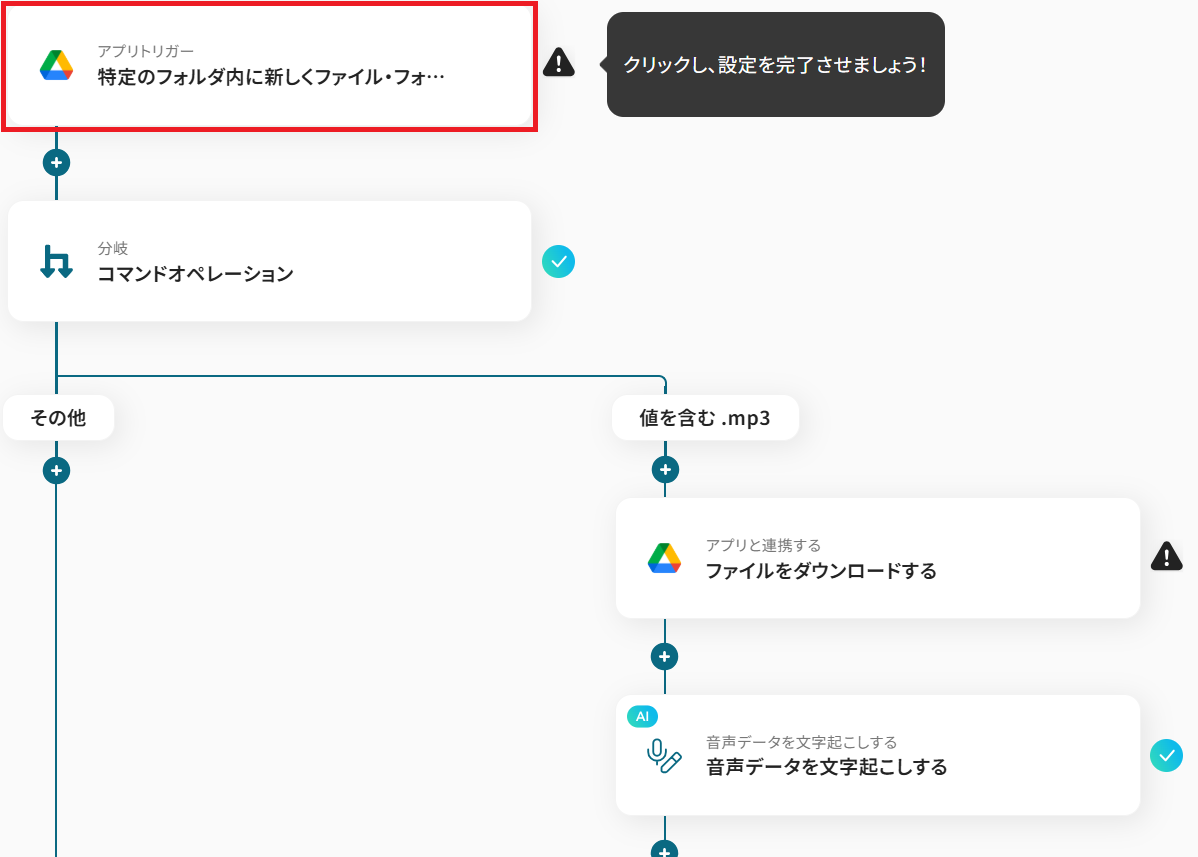- Google Driveのトリガー設定とアクション設定、分岐設定、文字起こし設定、各アクション設定