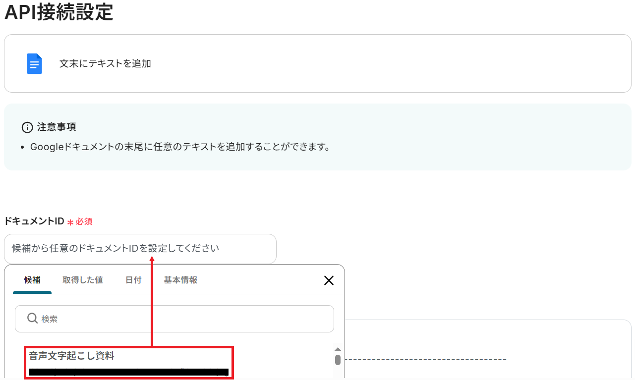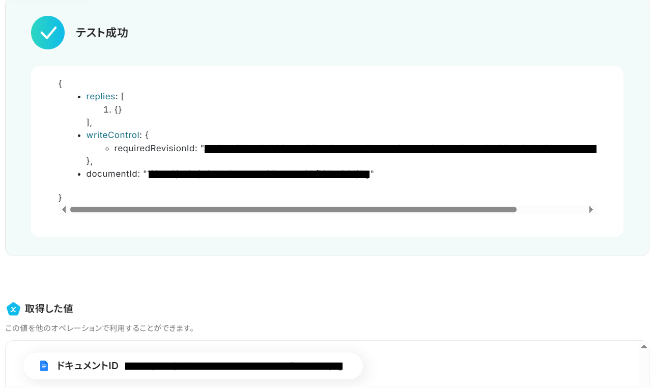今回はステップ7で指定したGoogleドキュメントのURLも固定値として入力しました。