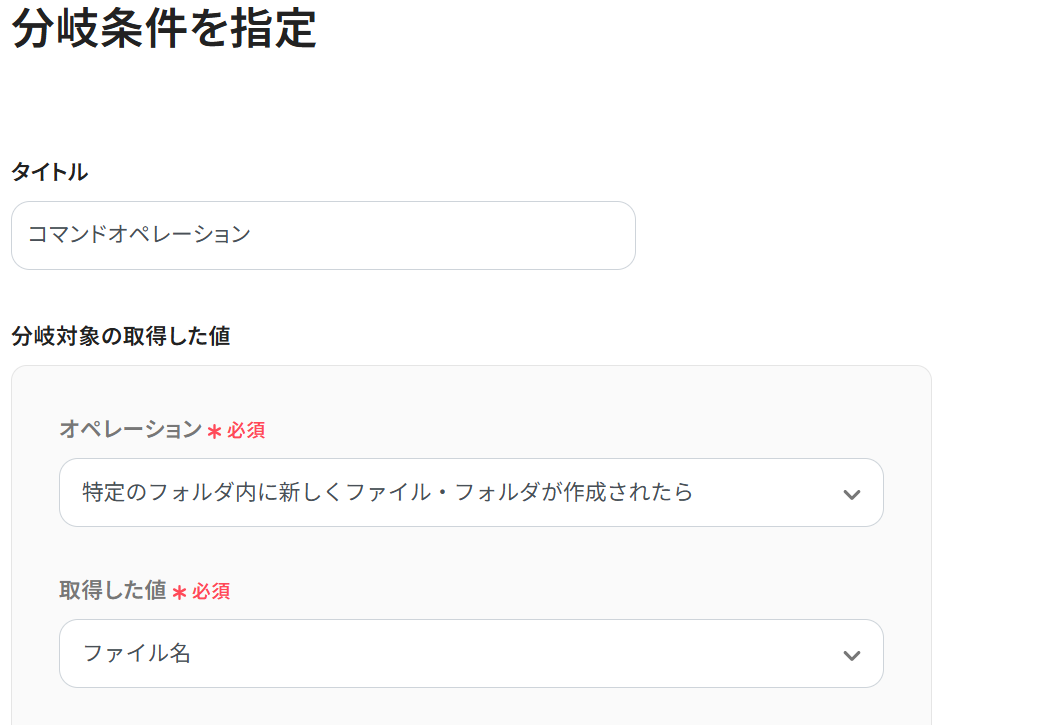オペレーションは「特定のフォルダ内に新しくファイル・フォルダが作成されたら」、取得した値は「ファイル名」のままで大丈夫です。