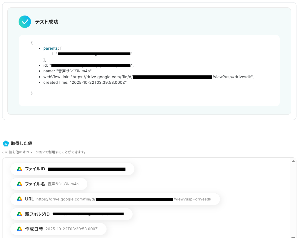 ファイルIDの欄にはGoogle Driveから取得した「ファイルID」の値が予め入力されているので、そのままテストしましょう。